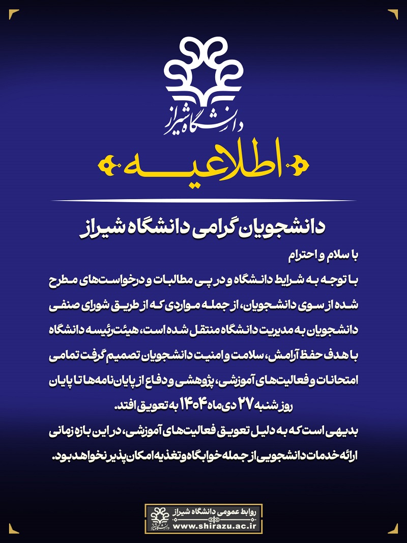 دانشجویان گرامی دانشگاه شیراز با سلام و احترام با توجه به شرایط دانشگاه و در پی مطالبات و درخواست‌های مطرح‌شده از سوی دانشجویان، از جمله مواردی که از طریق شورای صنفی دانشجویان به مدیریت دانشگاه منتقل شده است، هیئت‌رئیسه دانشگاه با هدف حفظ آرامش،...
