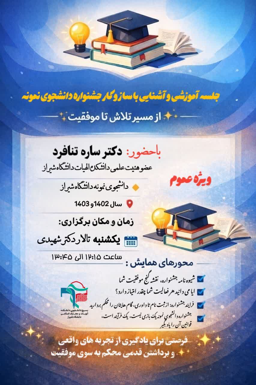 جلسه‌ای آموزشی با حضور دکتر ساره تنافرد، دانشجوی نمونه دانشگاه شیراز در سال‌های ۱۴۰۲ و ۱۴۰۳،  عضو هئیت علمی دانشکده الهیات دانشگاه شیراز