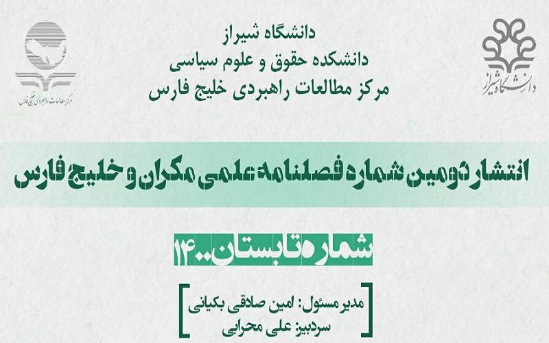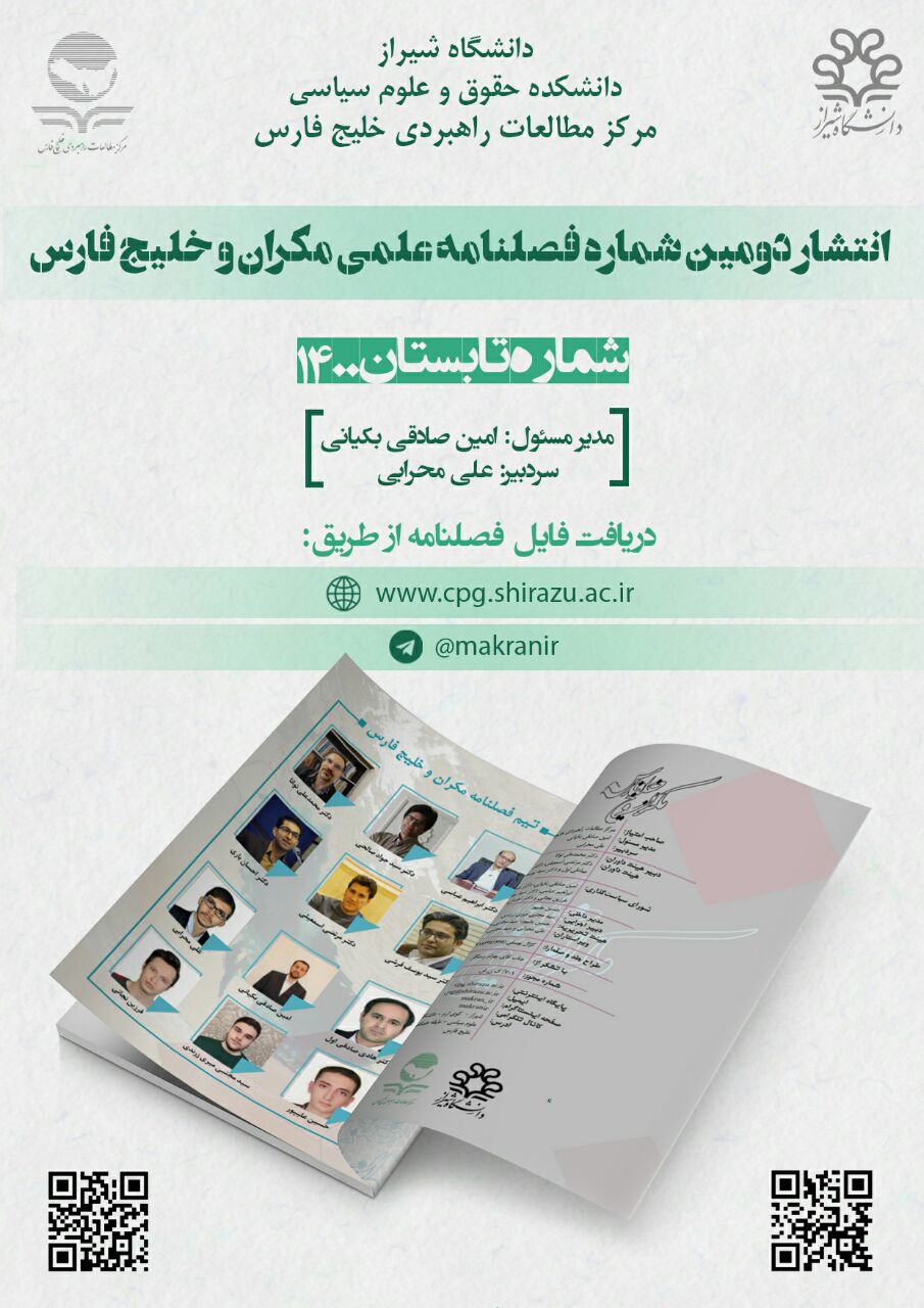 انتشار پنجمین شماره فصلنامه علمی-دانشگاهی مکران و خلیج فارس سال سوم / شماره پنجم / تابستان ۱۴۰۲ صاحب امتیاز: مرکز مطالعات راهبردی خلیج فارس دانشگاه شیراز مدیرمسئول و سردبیر: علی محرابی محورهای این شماره: تاب‌آوری خلیج فارس در پرتو تحولات...