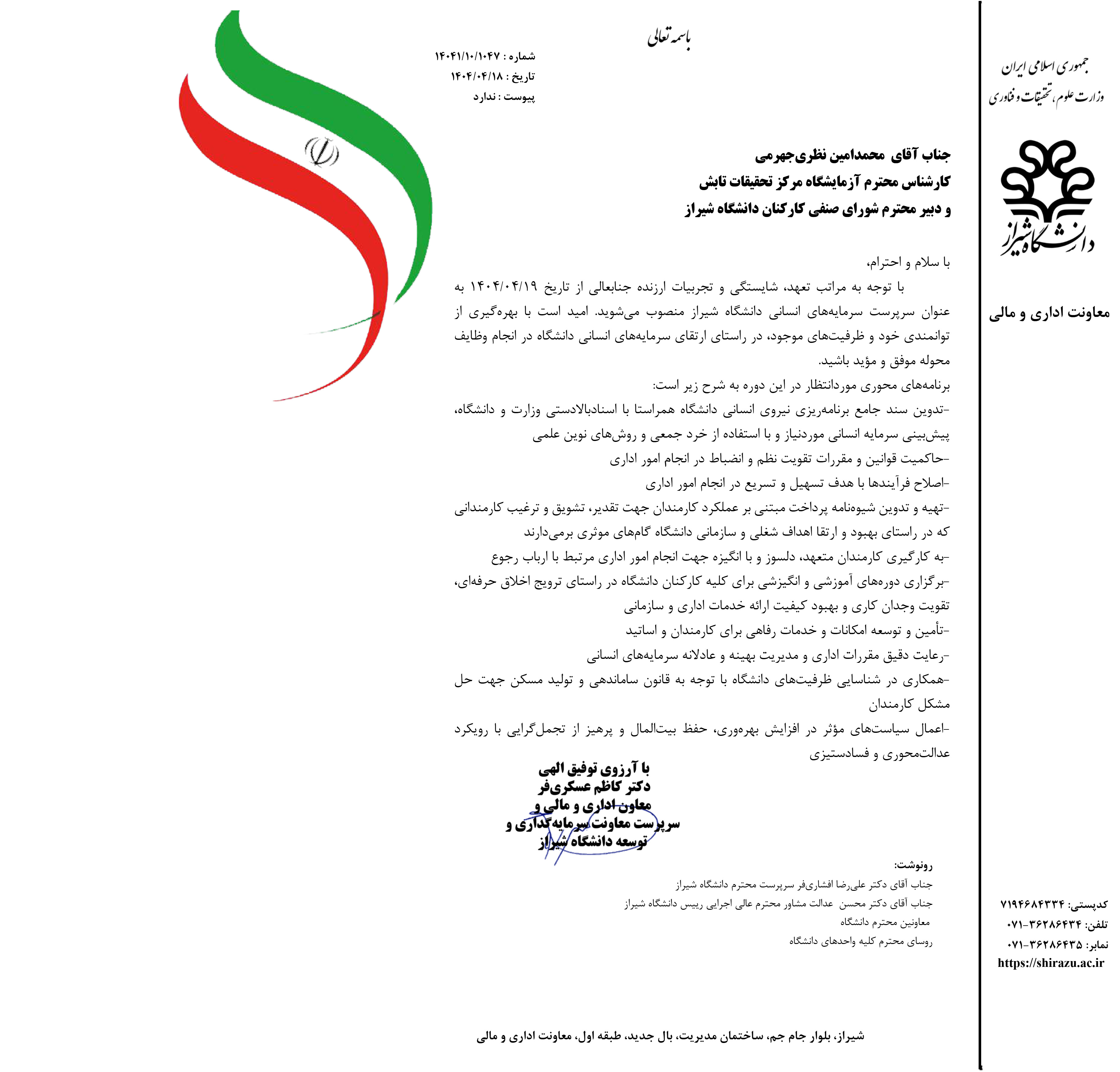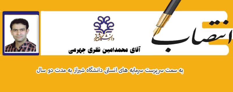 انتصاب آقای محمدامین نظری‌جهرمی از تاریخ 1404/04/19 به سمت سرپرست سرمایه های انسانی دانشگاه شیراز به مدت دو سال.
